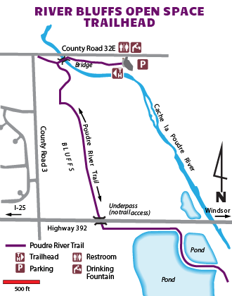 This is an excellent spot to start your trip down the Poudre River Trail, especially if you are coming from Interstate 25. Exit I-25 at Highway 392 (Exit No. 262), go East towards Windsor for 1.5 miles, turn left (North) onto County Road 3, then turn right (East) onto County Road 32E. The entrance to River Bluffs Open Space will be on your right in 0.25 miles.