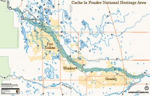 The Poudre River Trail Corridor is one portion of the Cache la Poudre River National Heritage Area. This area includes forty-five miles of the Cache la Poudre River, starting from where it flows out of the Roosevelt National Forest, northwest of Fort Collins. The Heritage Area extends to the confluence with the South Platte River, east of Greeley.