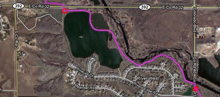 Description: Like most of the Poudre River Trail, this section is nearly level. From the access on the east end the trail travels through a grassy field before entering a grove of trees. It crosses several drainages before leaving the grove where it follows along near the river for a short distance before it makes a turn to the north and winds between two lakes. The trail extends north of HWY 392 by way of an underpass leading into the River Bluffs section built by Larimer County.