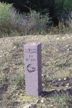 You may also see other larger granite markers that we call “Story Posts”. These trail sections such as Bison Arroyo, Overland Trail or Signature Bluffs are a historical reference for each area that the trail passes through. Click here to read more about the “Story Posts”. These trail sections are indicated along the profile at the bottom of our brochure map. Click here for our brochure map.